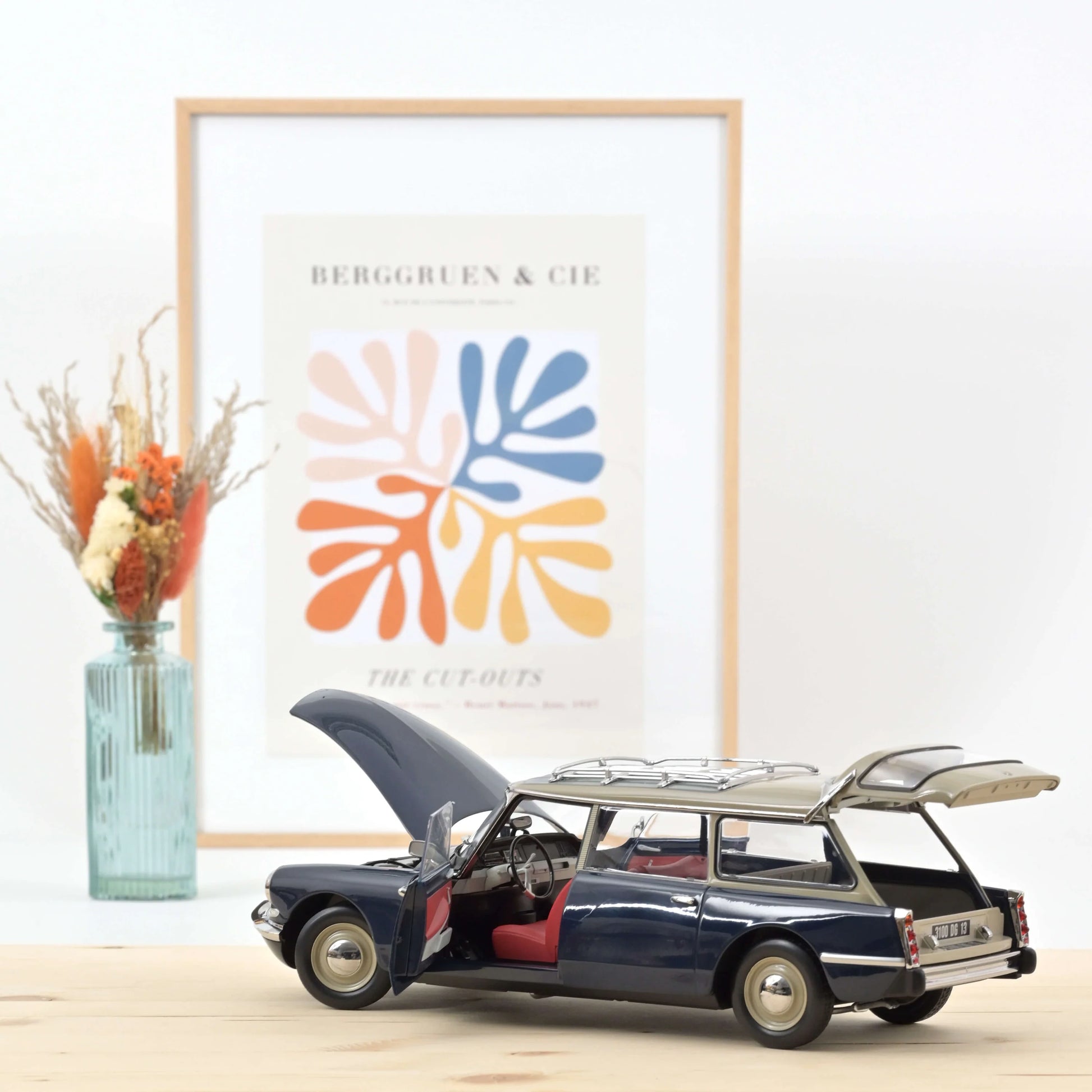 Prelepa minijatura Citroën ID 19 Break iz 1967., izvedena u tamnoplavoj “Orient Blue” boji, u razmeri 1:18. Izrađena od premium die‑cast metala i plastike, model uključuje 4 otvarajuća vrata i haubu, precizno izveden enterijer, realistične gume i pokretne prednje točkove. Montiran je na postolje sa vitrinom, idealno za online izloge ili kolekcionarsku prezentaciju.