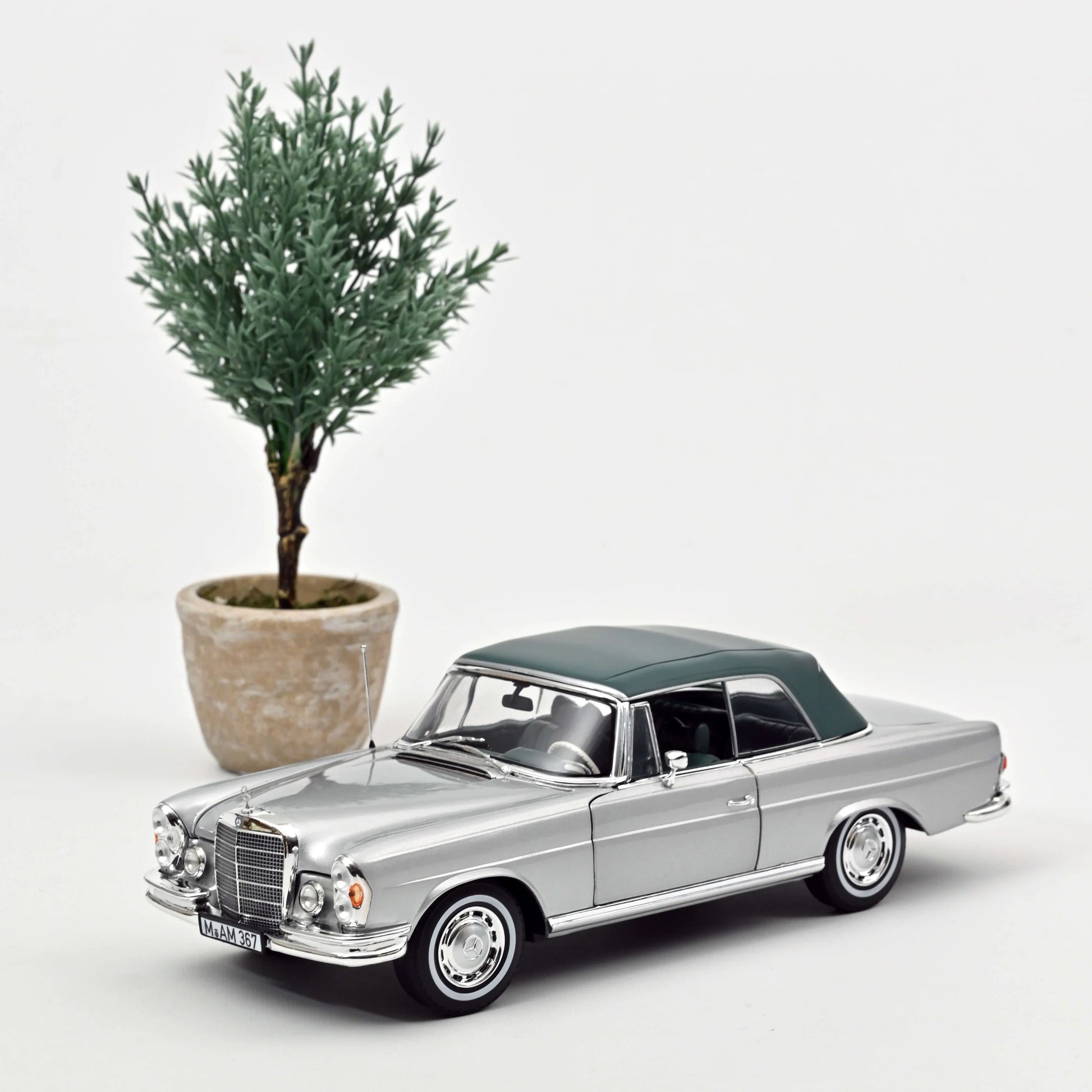 Elegantna i detaljna minijatura Mercedes‑Benz 280 SE Cabriolet iz 1969., u klasičnoj Silver Metallic nijansi, izrađena je u razmeri 1:18 od die‑cast metala i plastike. Model sadrži 4 otvarajuća vrata, haubu i prtljažnik, detaljno izrađen enterijer i realističan motorni prostor, sa pokretnim prednjim točkovima. Takođe dolazi s uklonjivim mekim krovom, montiran je na postolje s vitrinom – spreman za profesionalnu prezentaciju i kolekciju.