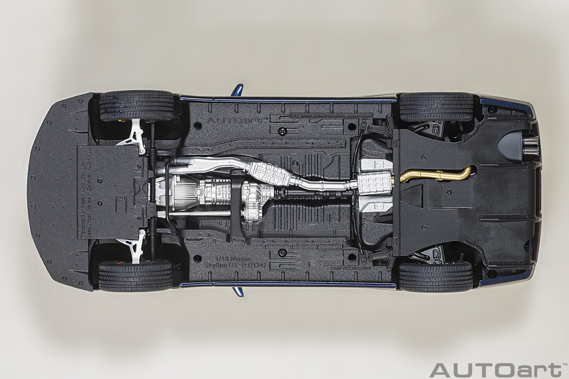 Model Nissan Skyline GT‑R (R34) V‑Spec II u raritetnoj boji Midnight Purple III, razmere 1:18, izrađen je od vrhunskog kompozitnog diecast materijala od strane Autoart (SKU 77403).
