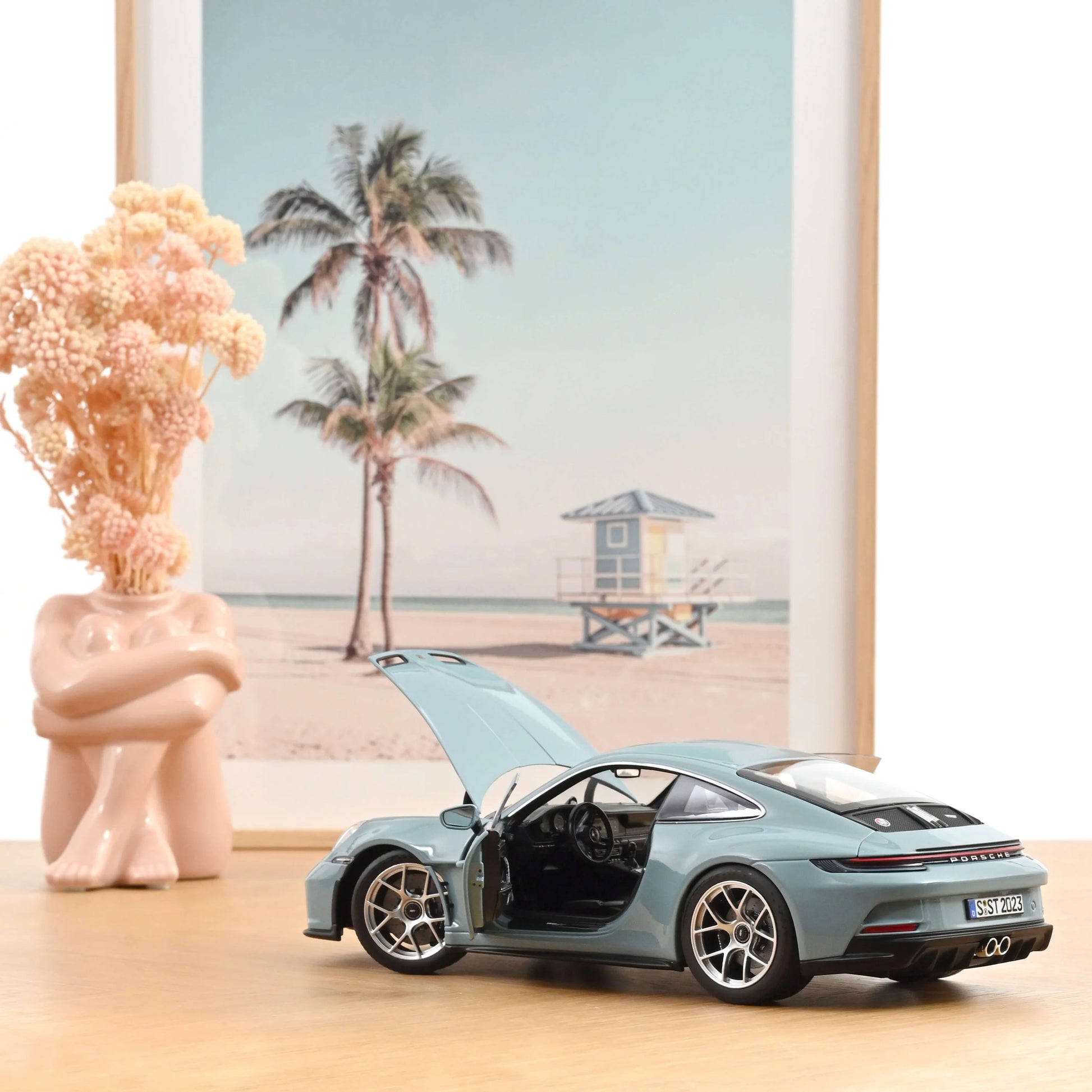 Model Porsche 911 S/T iz 2023. godine u razmeri 1:18 predstavlja preciznu repliku limitirane verzije ovog legendarnog sportskog automobila, izrađene povodom 60. godišnjice modela 911. Izrađen u elegantnoj Bleu Meissen boji, ovaj model verno prikazuje originalni dizajn, uključujući detalje poput otvarajućih vrata i prednje haube, kao i upravljivih prednjih točkova.