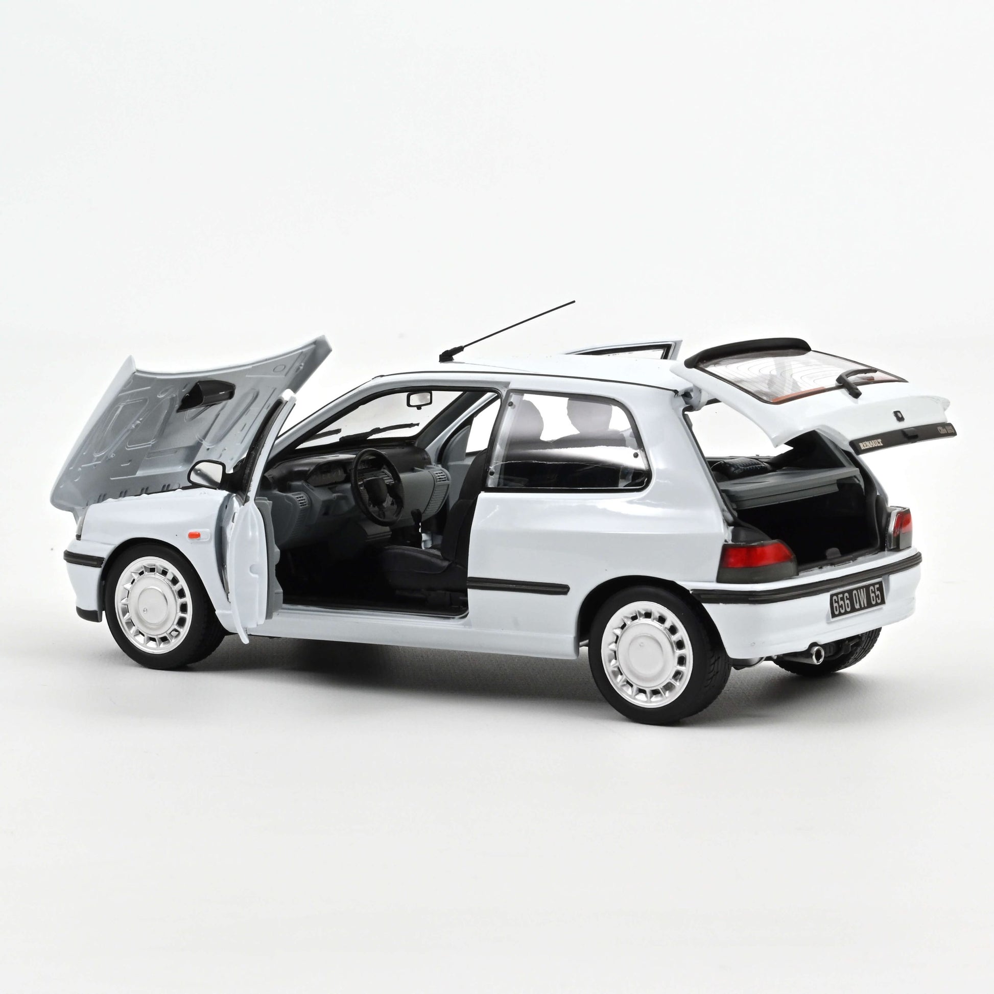 Autentična reprodukcija prve generacije Clio 16S Phase I iz 1991. u karakterističnoj Glacier White boji. Model proizveden od die-cast metala sa detaljno oslikanom belom karoserijom. Poseduje četiri otvarajuća dela — hauba, oba prednja vrata i zadnji prtljažnik — kao i pokretive prednje točkove, čime se postiže visok nivo interaktivnosti i realizma za kolekcionare.