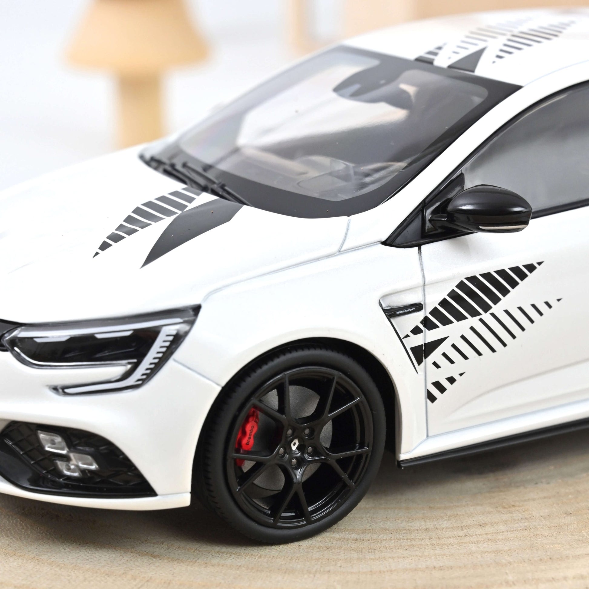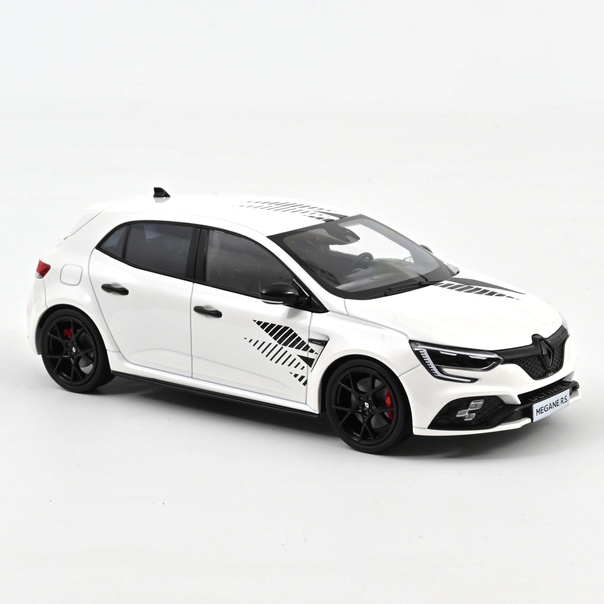 Ekskluzivno izdanje Megane R.S. Ultime iz 2023. u sofisticiranoj Pearl White boji. Ovaj 1:18 die-cast model dolazi iz renomiranog Norev-a (referenca 185396), tačno prikazuje karoseriju bez otvarajućih panela, ali sa realističnim detaljima poput “Renault Sport” pruga, crnih retrovizora, ručica i 19” felni u Crash Black Fuji Light dizajnu, što doprinosi agresivnoj stazi inspirisanoj estetici. Precizno izrađeni kočioni caliperi i završni detalji unutar felni govore o visokokvalitetnoj reprodukciji originala.
