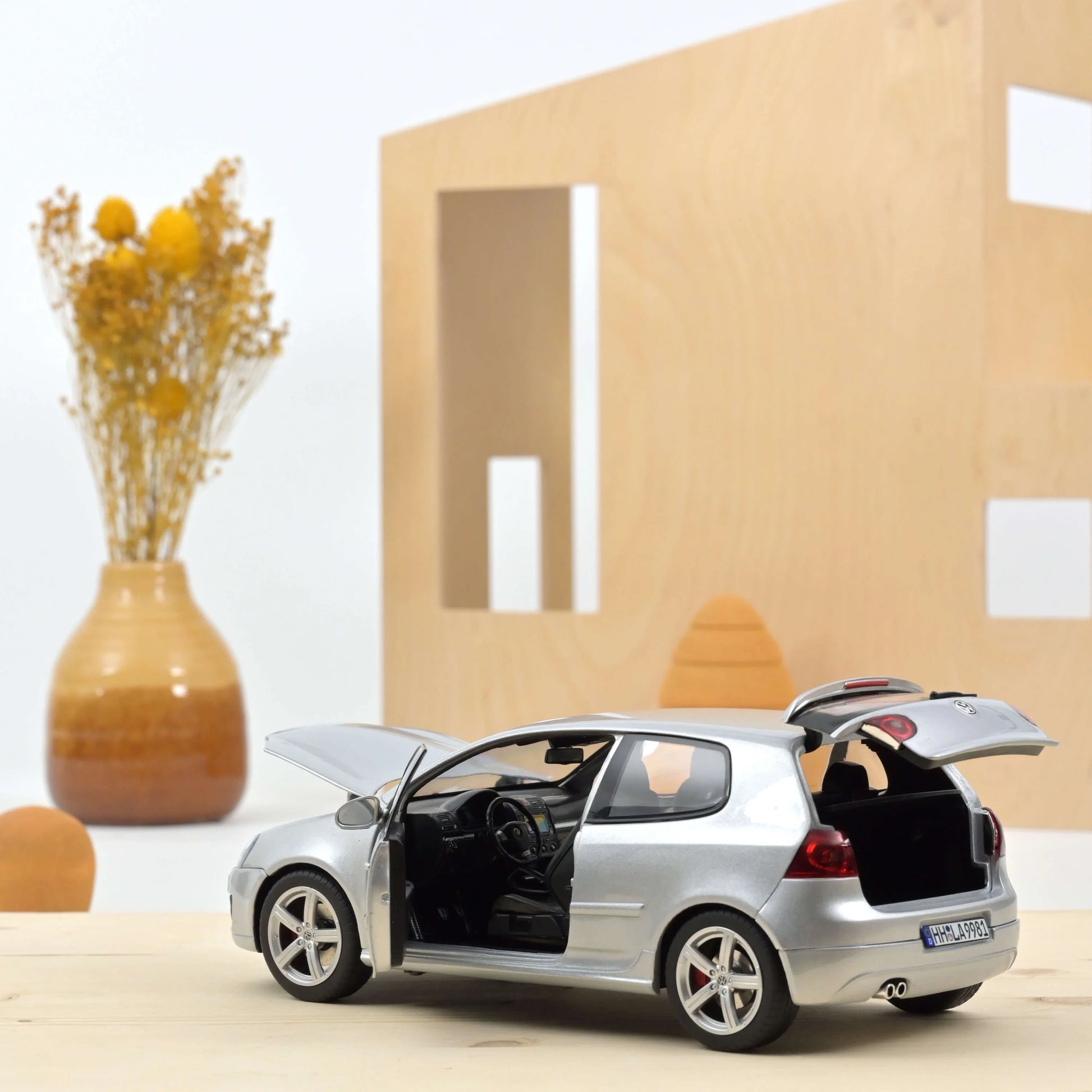 Ovaj model VW Golf GTI Pirelli iz 2007. godine u metalik srebrnoj boji donosi sav prepoznatljivi dizajn GTI linije – crna maska sa crvenom trakom i GTI znak. Napravljen je u razmeri 1:18 od die‑cast metala i plastike, sa realističnim gumama i funkcionalnim prednjim točkovima. Otvaraju se vrata, gepek i hauba, pružajući uvid u detaljan enterijer sa crno‑crvenim sportskim sedištima i hromiranim detaljima na kontrolnoj tabli.